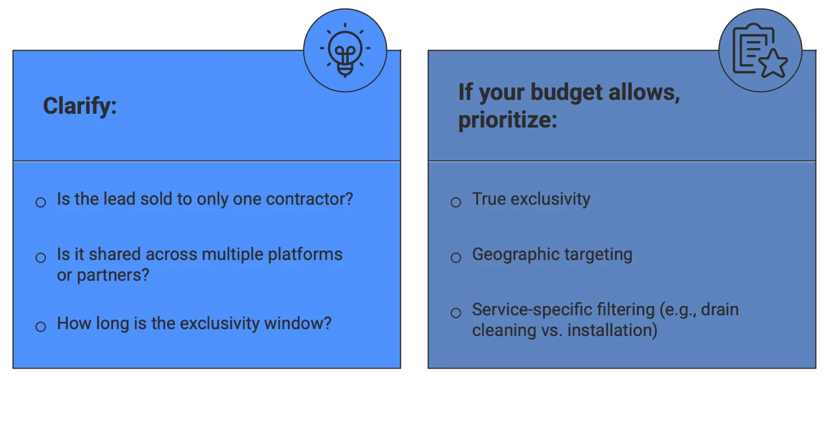 • Exclusive leads: Sent to only one contractor. Higher cost, better conversion potential.