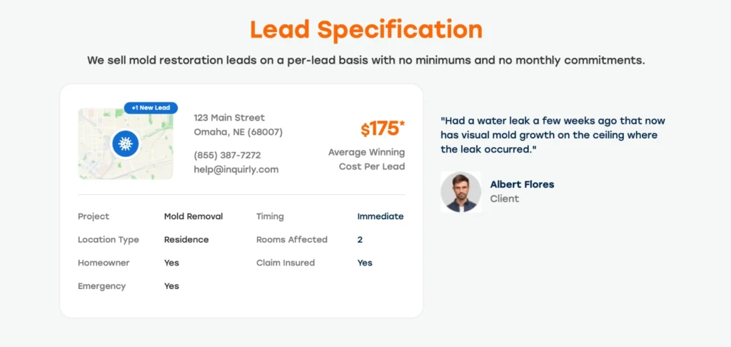 Inquirly.com offers exclusive mold removal leads – meaning the homeowner inquiry goes only to your company, not to three or four competitors. This exclusivity dramatically increases close rates and reduces wasted ad spend.
